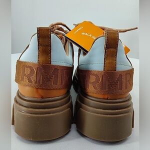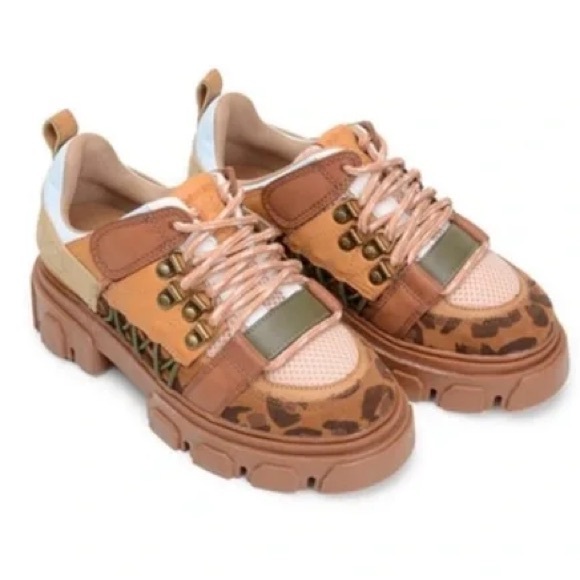 Stylish sneakers with a chunky sole. Features a mix of patterns and colors. Comfortable and trendy design.