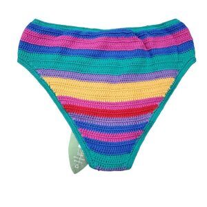 Vibrant crochet bikini bottom. Features stripes in multiple colors. High-waisted design. Perfect for a bold beach look.
