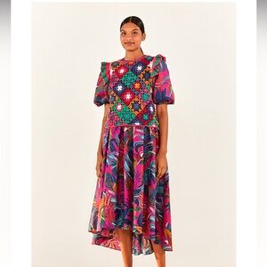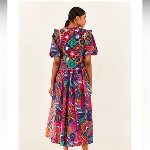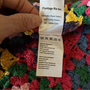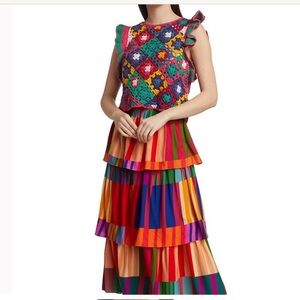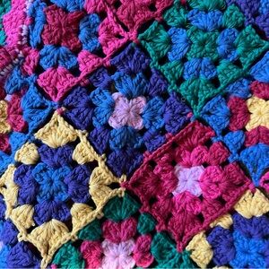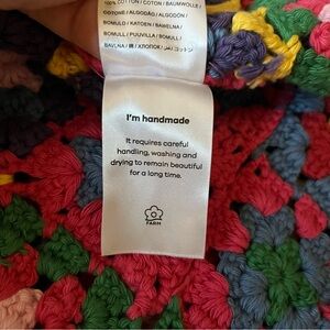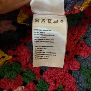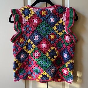Vibrant crochet top with ruffle sleeves. Features a colorful patchwork design. Perfect for a bold, stylish look.