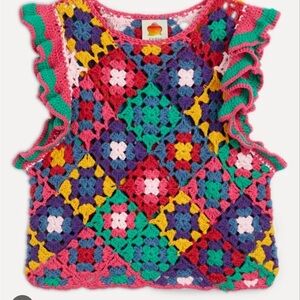 Vibrant crochet top with ruffle sleeves. Features a colorful diamond pattern. Perfect for a bold look.