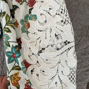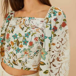 NWT farm rio off white botanicals blouse. Vibrant embroidered blouse with floral patterns. Features intricate lace details and puff sleeves. Perfect for adding color to your outfit. 100% cotton. Beautiful!