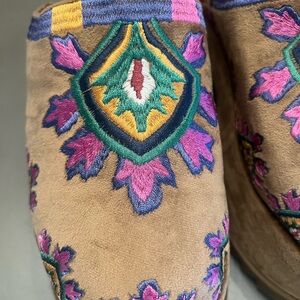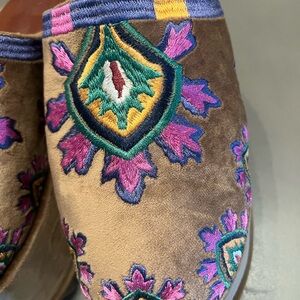 Vibrant mules with intricate embroidery. Features a mix of colors for a bold look. Comfortable slip-on design.