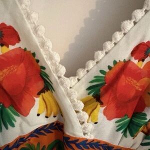 Vibrant floral design. Features red, green, and orange patterns. Sleeveless with a deep V-neck.