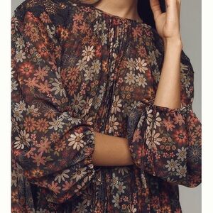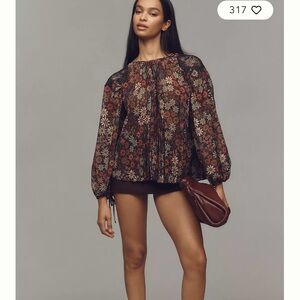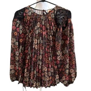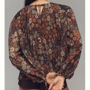 Elegant blouse with floral design. Features long sleeves and a flowy fit. Ideal for versatile styling.