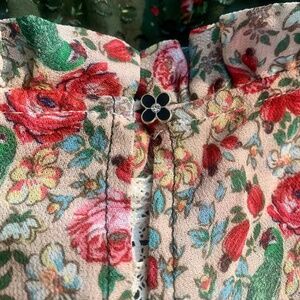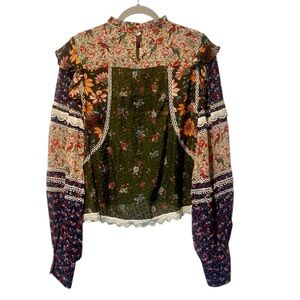 Vibrant floral blouse with lace details. Features a mix of green, blue, and cream patterns. Long sleeves with ruffle accents. It has not been worn in and in great condition. Love it, but was not a great fit for me.