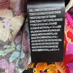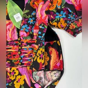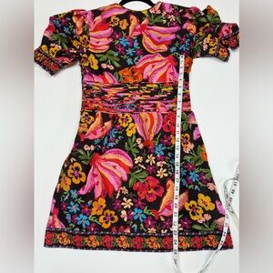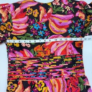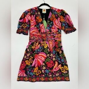 Vibrant floral dress with a deep V-neck. Features puff sleeves and a fitted waist. Perfect for a bold statement.
