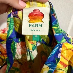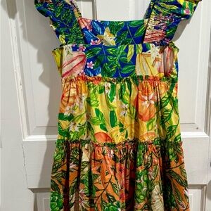 Vibrant mini dress with floral patterns. Features shades of blue, green, yellow, and orange. Perfect for a lively look.