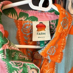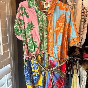 Bold jumpsuit with vibrant floral patterns. Features pink, orange, blue, and green hues. Eye-catching and unique design.