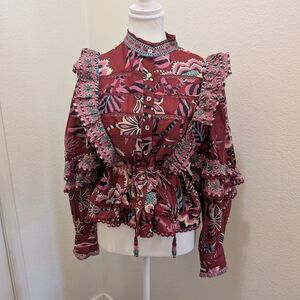 Chic floral blouse with vibrant ruffles. Perfect for a bold look. Comfortable and stylish.