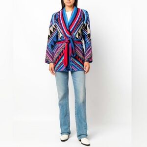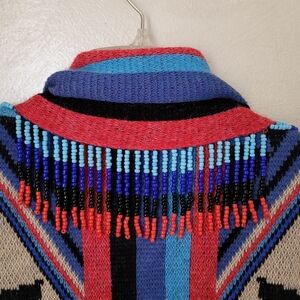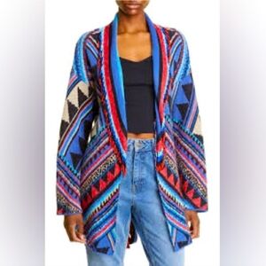 Vibrant geometric pattern. Open front with belt. Long sleeves. Cozy and stylish.