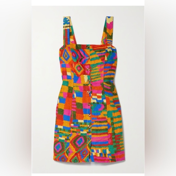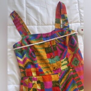 Bold geometric patterns in vibrant hues. Farm Rio Summer Patches mini dress. Used once and in pristine condition. Has been dry cleaned and ready to ship. See pics for approximate measurements.