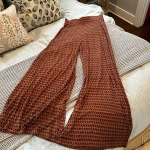Brown geo print wide-leg pants with elastic waist. Perfect for a bold fashion statement.