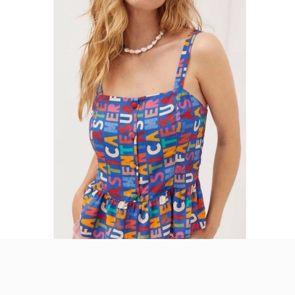 Bold tank top with vibrant graphic print. Features a playful mix of colors. Ideal for a standout look.