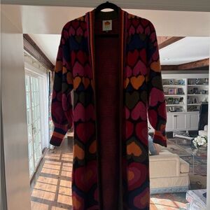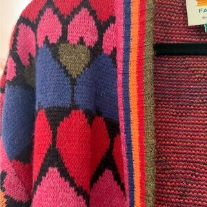 Vibrant cardigan with heart pattern. Features a tie belt. Cozy and stylish.