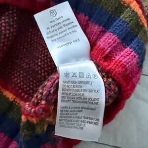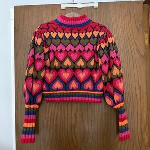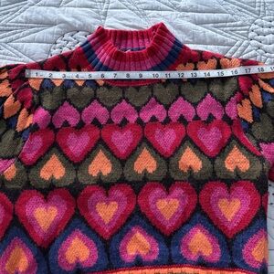 Vibrant crew neck sweater with heart pattern. Features bold colors and cozy fit. Perfect for a statement look.