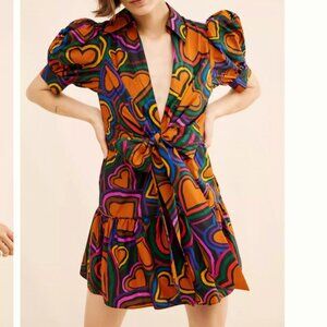 Vibrant dress with heart patterns. Features puff sleeves and a tie front. Perfect for a bold look.