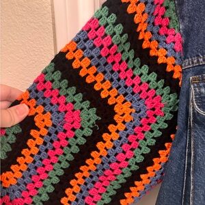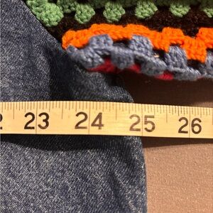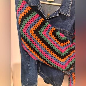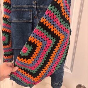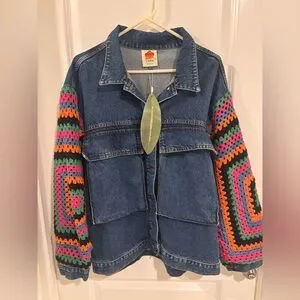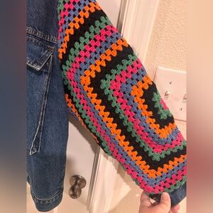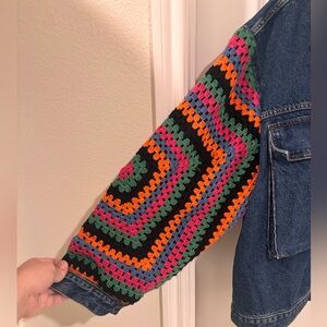 Stylish jean jacket with vibrant crochet sleeves. Features blue denim with colorful patterns. Perfect for a bold look.