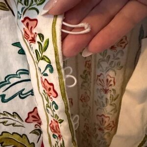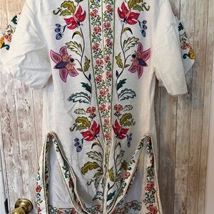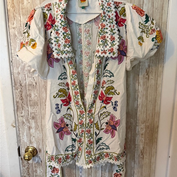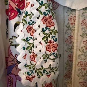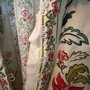 Vibrant jumpsuit with floral patterns. Features a mix of red, green, and white. Perfect for a bold look. First loops for buttons need to be reattached. She photo.