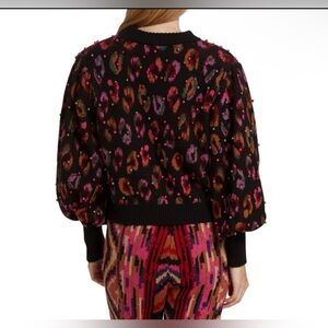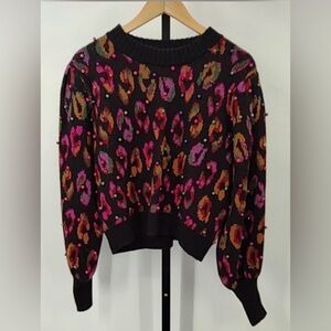 Bold knit sweater with vibrant patterns. Features pink, orange, and black hues. Unique textured design.