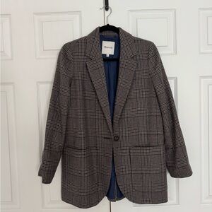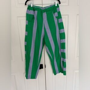 Colorful top with a bold leaf pattern and Toucans Features shades of green, orange, and brown. Shoulder pads.