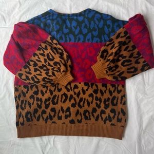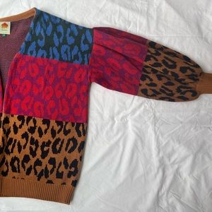 Vibrant cardigan with leopard print. Features red, blue, and brown blocks. Cozy and stylish.
