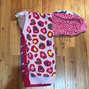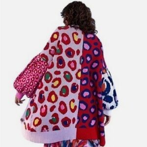 Vibrant leopard print cardigan. Features bold colors and button closure. Perfect for a statement look.