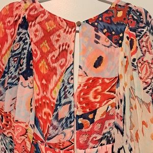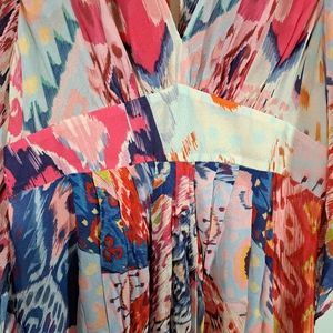 Vibrant maxi dress with a flowing silhouette. Features a mix of red, blue, and white patterns. Perfect for a bold, stylish look.