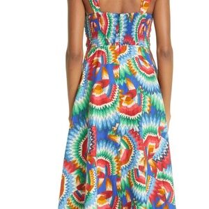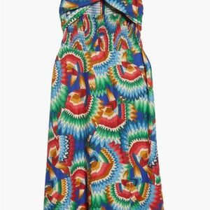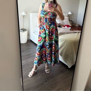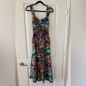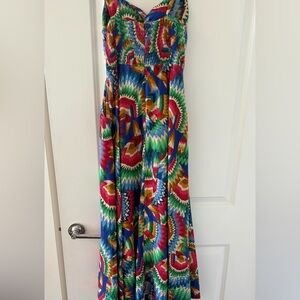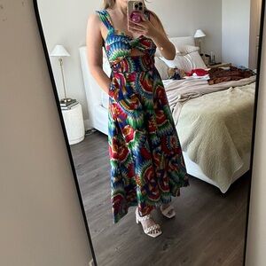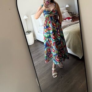 Vibrant maxi dress with a bold multicolor pattern. Features a twisted front design. Sleeveless with a flowing skirt.