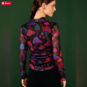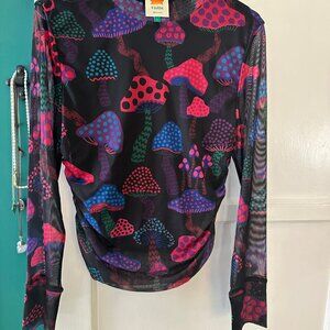 Vibrant mesh blouse with a playful mushroom pattern. Long sleeves. Perfect for a bold look.