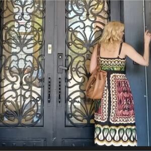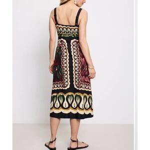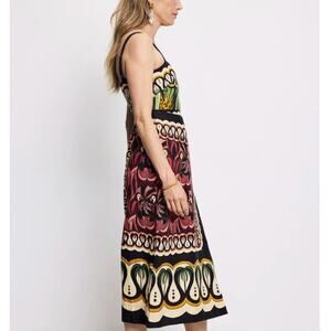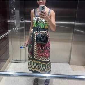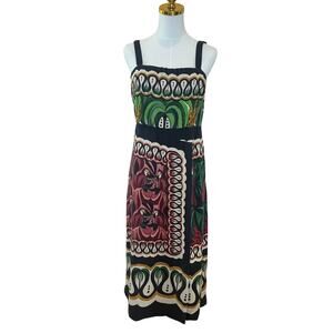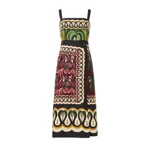 Vibrant midi dress with bold patterns. Features a mix of red, green, and black. Perfect for a stylish look.