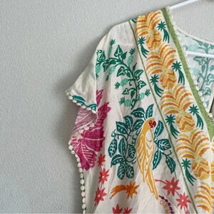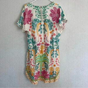 Vibrant mini dress with floral patterns. Features pink, blue, and yellow hues. Perfect for summer outings.