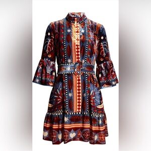 Vibrant mini dress with bold patterns. Features flared sleeves and a playful design. Has a belt. Perfect for adding color to your wardrobe. Heavier weight velvet material. So beautiful.