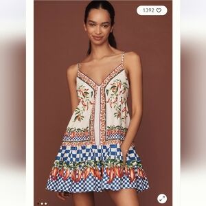 Vibrant mini dress with a playful pattern. Features a mix of floral and geometric designs. Perfect for a lively look.