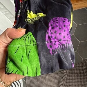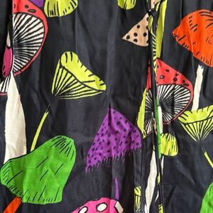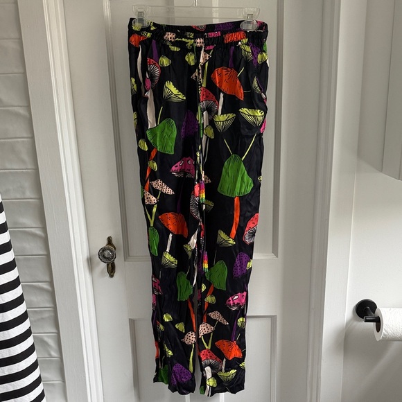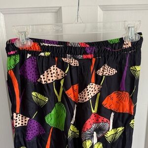Vibrant mushroom print pants. Elastic waistband. Comfortable fit. Beaded tassel on functional drawstring.