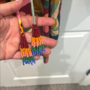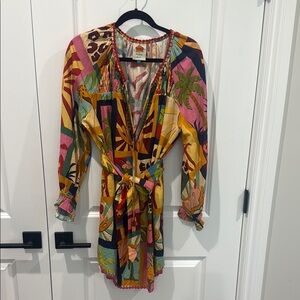 Vibrant linen dress featuring a mix of animal and geometric prints. Long sleeves with ruffle cuffs. Includes a matching belt for a cinched waist.