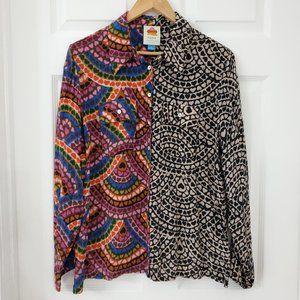 Vibrant blouse with bold patterns. Features a mix of colors and unique design. Perfect for a stylish look.