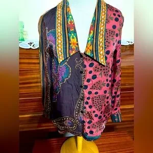 Vibrant blouse with intricate patterns. Long sleeves. Perfect for a bold look.