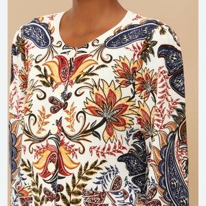 Chic blouse with intricate patterns. Features vibrant blue, red, and cream hues. Perfect for stylish outings.