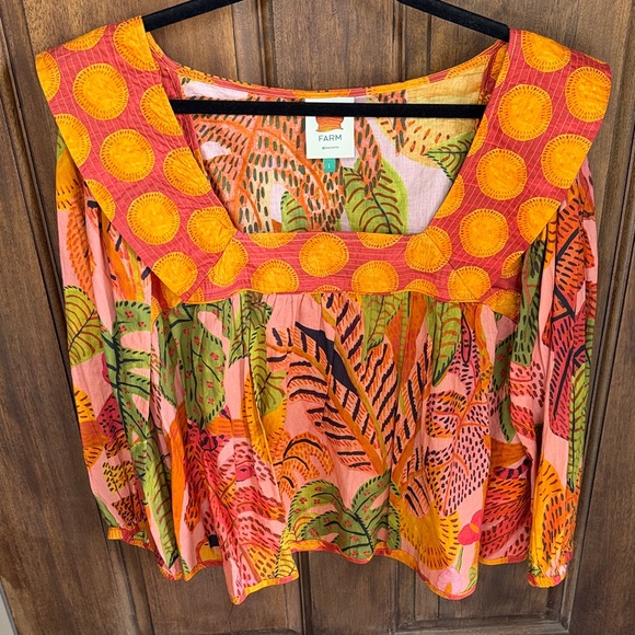 Vibrant blouse with orange and pink patterns. Green leaf details. Perfect for a bold style.