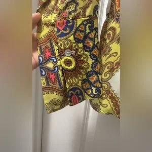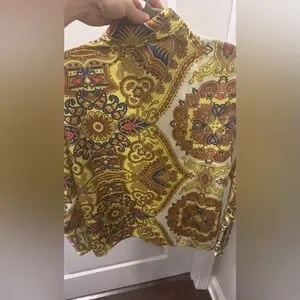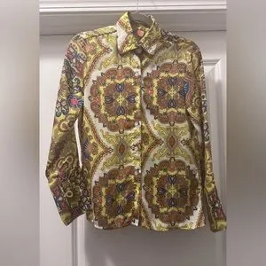 Vibrant blouse with intricate patterns. Features a mix of yellow, brown, and blue. Button-up front with a classic collar.