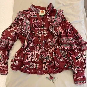 Vibrant blouse with multicolor patterns. Features bold designs and intricate details.