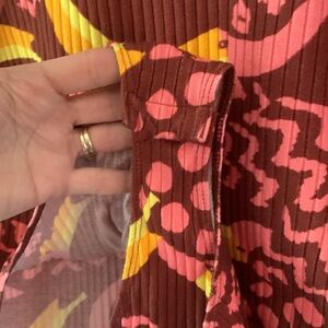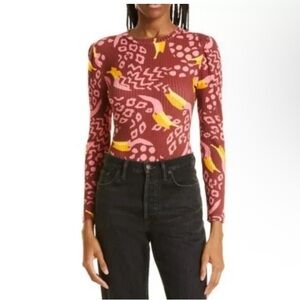 Vibrant bodysuit with abstract patterns. Long sleeves. Perfect for a bold look.