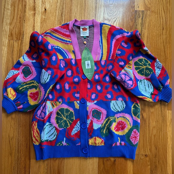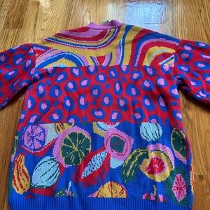 Vibrant cardigan with bold patterns. Features a mix of colors and button closure. Perfect for a statement look.