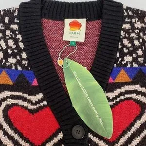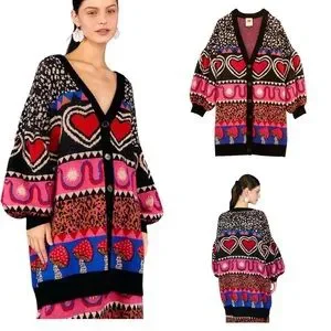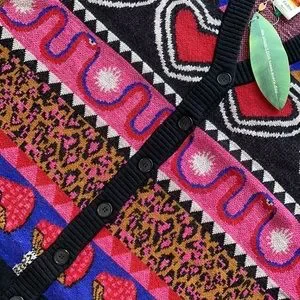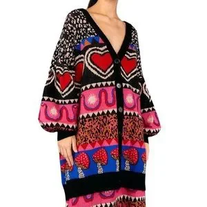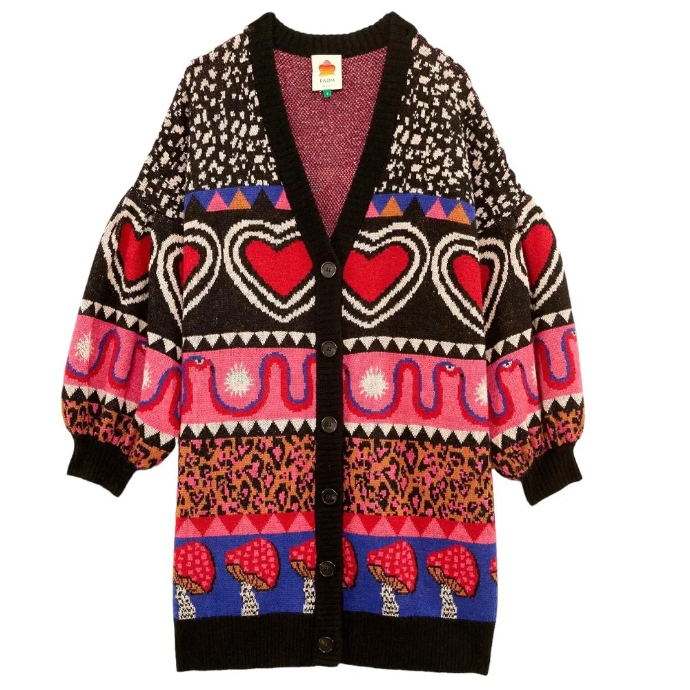 Vibrant cardigan with heart and mushroom patterns. Features bold colors and unique design. Perfect for a statement look.