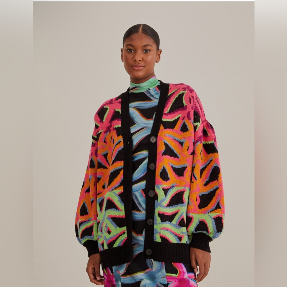 Vibrant cardigan with bold patterns. Features button-up front. Perfect for a statement look.