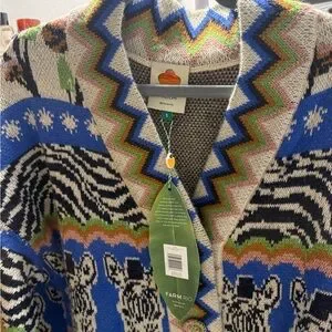 Vibrant cardigan with zigzag and animal patterns. Features blue, green, and orange accents. Cozy and stylish.