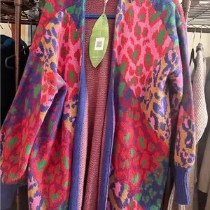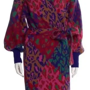 Vibrant cardigan with bold patterns. Features a tie belt and long sleeves. Perfect for a statement look.