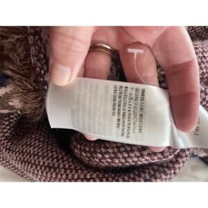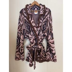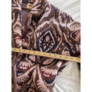 Stylish cardigan with intricate patterns. Features a blend of pink, brown, and blue hues. Perfect for layering.