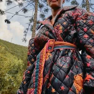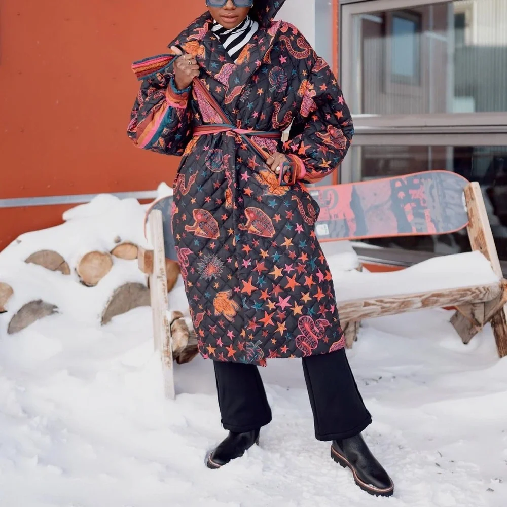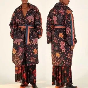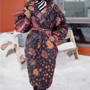 Vibrant patterned coat with belt. Features stars and abstract designs. Perfect for a bold statement.