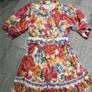 Bold FARM Rio dress with vibrant patterns. Features red, orange, and purple hues.